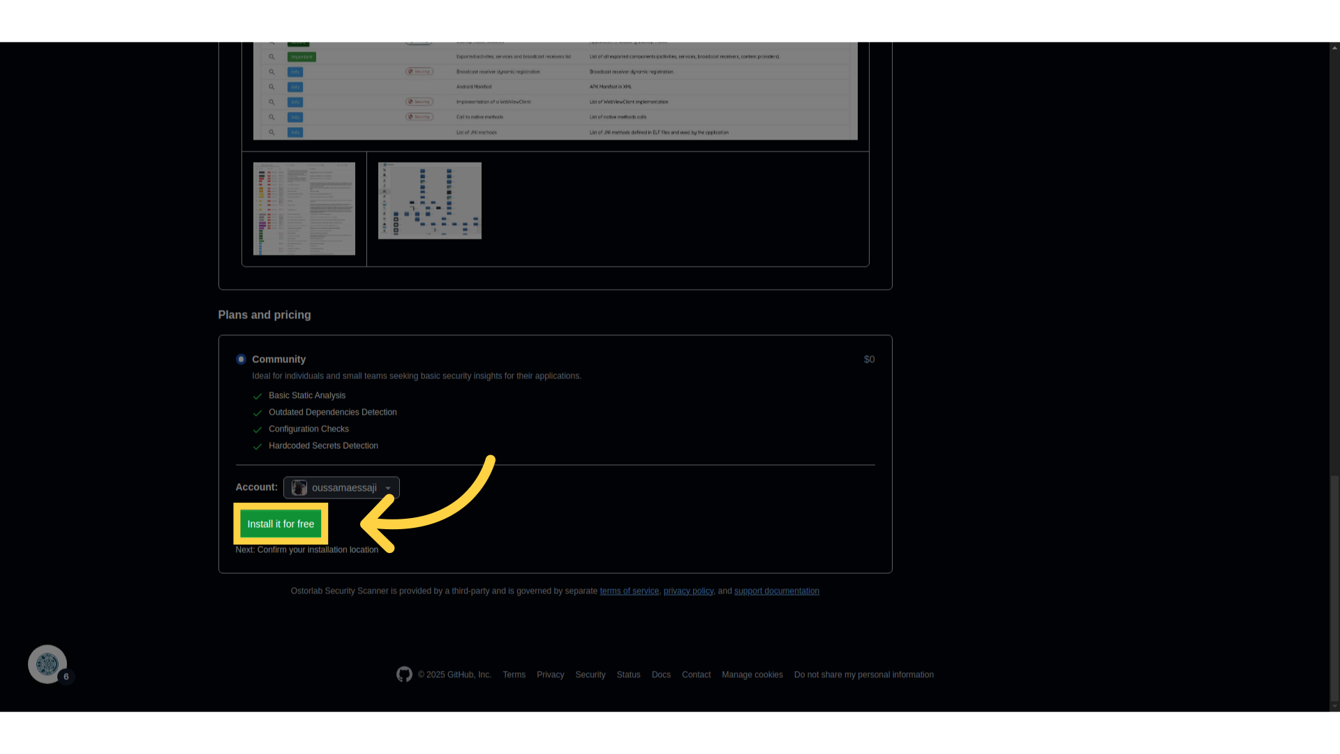 The Ostorlab Security Scanner GitHub App should be used in conjunction with an Ostorlab Github Actions workflow as explained in steps 1 and 2.